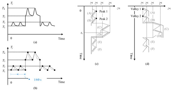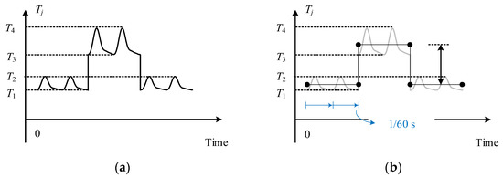The complete peak–valley profile typically contains a massive amount of data. The semiconductor junction temperature typically cycles in a fundamental frequency (60 Hz or 50 Hz, depending on the region), as shown in Figure 6. Each fundamental period contains one peak and one valley. If all peaks and valleys are recorded, a 15 min peak–valley profile contains 108,000 data points, and a 3-year peak–valley profile contains more than one billion data points.