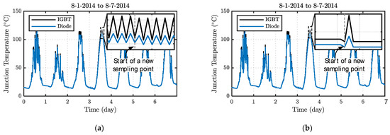 Common simulation algorithms such as the Euler–Maruyama method can be adopted to determine the junction temperature. The power loss of semiconductors typically cycles in fundamental cycles (50 or 60 Hz) [44]. The Euler–Maruyama method requires the time step to be much smaller than the fundamental period (a value of approximately 100 μs is typically used in simulations to capture the fast switching frequency of 10 to 100 kHz) in order to achieve an acceptable accuracy [26]. Such small time steps are computationally burdensome for long-term simulations.