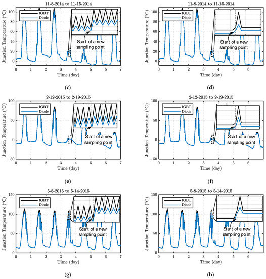 IGBT and diode junction temperature profile for a PV inverter with 7 days of insolation data. (a) Sample complete peak–valley profile for 4 August 2014; (b) sample reduced peak–valley profile for 4 August 2014; (c) sample complete peak–valley profile for 11 November 2014; (d) sample reduced peak–valley profile for 11 November 2014; (e) sample complete peak–valley profile for 15 February 2015; (f) sample reduced peak–valley profile for 15 February 2015; (g) sample complete peak–valley profile for 11 May 2015; and (h) sample reduced peak–valley profile for 11 May 2015.