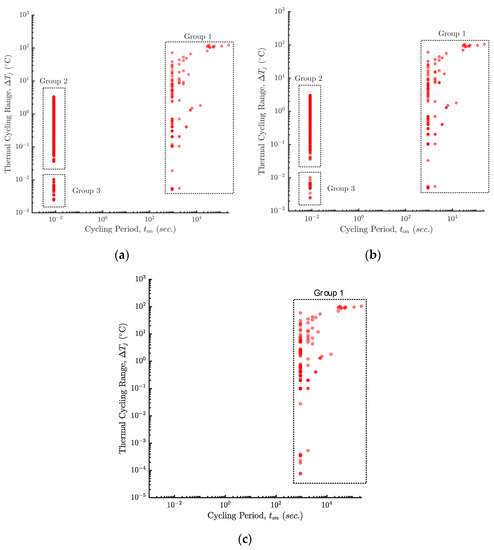 The number of cycles for each group is summarized in Table 14. Group 1 refers to the peak–valleys with large (greater than 5 °C). Group 2 refers to the peak–valleys with relatively small (between 0.02 to 5 °C). Group 3 refers to the peak–valleys with extremely small (less than 0.02 °C). The complete thermal profile contains a large number of thermal cycles from groups 2 and 3 (on the order of 107), whereas a relatively small number of thermal cycles from group 1 (125 cycles) is included. The reduced thermal profile and the averaged thermal profile have a similar number of thermal cycles from group 1 as the complete thermal profile. However, there a significantly fewer thermal cycles from groups 2 and 3 than from the complete thermal profile.