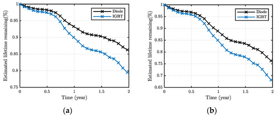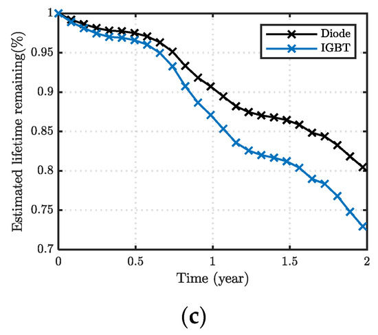 where AF is the accumulated fatigue (20.85% for IGBT and 13.98% for the diode), and tsim is the simulation time (two years). The IGBT and diode are expected to have a lifetime of 9.59 years and 14.31 years, respectively, given the simulated condition. Thus, the IGBTs determine the overall lifetime of the PV inverter instead of the diodes in this case.
