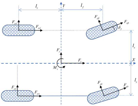 where m is vehicle mass. is vehicle velocity along the X-axis. is the vehicle velocity along the Y-axis. is the yaw moment of the inertia around the Z-axis of the mass center of the vehicle. and represent the front left wheel, front right wheel, rear left wheel and rear right wheel of the vehicle, respectively. is the vehicle yaw rate. and stand for tire longitudinal and lateral forces. is the steering angle of front wheels. , and represent the distance from the center of mass to the front axle, the rear axle and half of the tread, respectively. is the sum of each resistance term, including aerodynamic drag resistance, rolling resistance and gradient resistance, as follows: