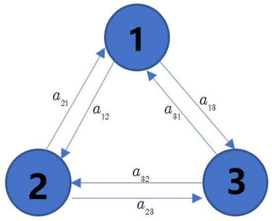 A multi-intelligence system consists of several individual agents with communication capabilities, which cooperate with each other to accomplish goals through information interaction between neighboring agents. Multi-agent systems are flexible and autonomous and have significant advantages in calculation efficiency. According to Equation (10), the vehicle dynamics formulas in the longitudinal, lateral and yaw directions can be used as three intelligent agents. The multi-agent topology structure diagram is designed, as shown in Figure 2.