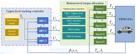 The chassis control system of FWID-EVs translates optimization decisions into vehicle behavior, and it is the lowest and most important aspect of the vehicle [5]. The chassis control system sends control commands to achieve precise control of the vehicle speed and attitude with reference to the demand trajectory dynamically planned by the intelligent networked system, combined with the real-time vehicle status and considering indicators such as safety, economy and comfort [6]. Researchers have designed a variety of chassis-integrated control systems, and hierarchical integrated control strategies have obvious advantages in terms of computational complexity and control flexibility [7,8,9,10,11,12,13]. In the literature [10], a sliding mode controller with adaptive proportional integration was designed in the upper layer to calculate virtual control values that guarantee lateral stability, and the dynamic control method was used to distribute the steering torque and longitudinal torque in the lower layer. The simulation results showed that the proposed method effectively improves the stability and safety of the vehicle.