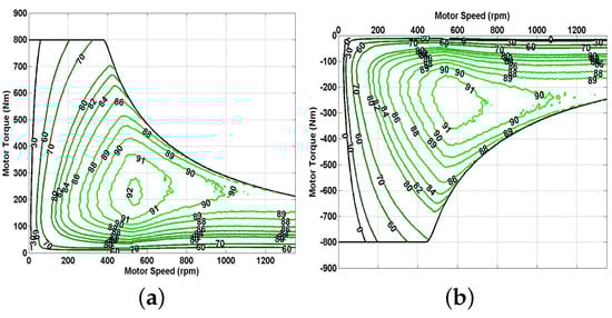where is the motor speed. and denote the motor drive and braking torque, respectively. The direction of energy flow in the regenerative braking energy recovery mode is the opposite direction of energy flow in the drive energy consumption mode, and both do not exist at the same time. indicates the efficiency of the motor, which can be obtained from the motor drive and braking efficiency map shown in Figure 4.