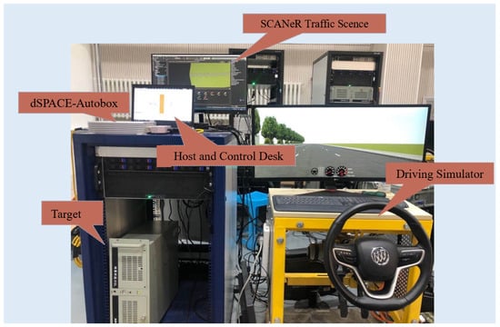 In order to verify the performance of the chassis controller proposed in this study, a hardware-in-the-loop simulation platform was built.The structure of the experimental platform is shown in Figure 5. The simulation platform has high real-time reliability. It includes a host for the SCANeR traffic scenario model, a dSPACE for running real-time algorithms, a target machine for running real-time a vehicle model, a driving simulator and a host for running the CarSim vehicle and control desk. The driver manipulates the steering wheel of the driving simulator to produce a certain steering wheel angle. The control module calculates the required torque according to the real-time traffic information and vehicle status transmitted via an Ethernet connection. The steering wheel angle and torque signal are sent to the target machine in real time, and the vehicle position change is synchronized to the traffic scene through Ethernet; thus, the traffic information and vehicle status change. The control module calculates the four-wheel drive torque again according to the updated information. Thus, a closed-loop is formed. The two conditions are Dual Lane Change (DLC) test conditions and the standard World Light Vehicle Test Cycle (WLTC).