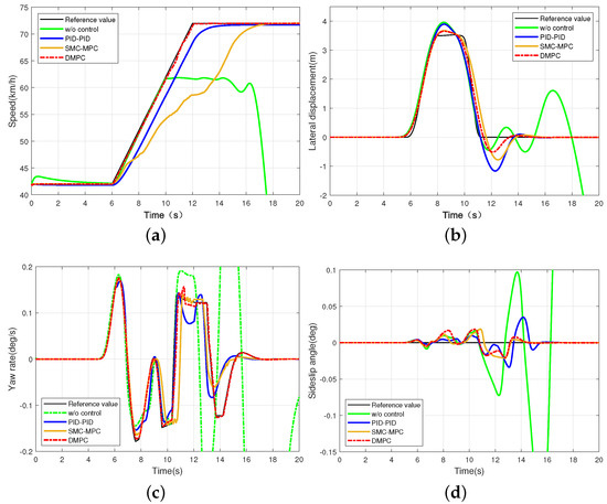 The tracking results of vehicle states including the vehicle velocity, the lateral displacement, the yaw rate and the side-slip angle are plotted in Figure 6. As can be seen in Figure 6a, the vehicle without the control algorithm was unable to track the desired speed in the DLC condition with low adhesion. Meanwhile, as shown in Figure 6b–d, the vehicle was seriously unstable, and the yaw rate and side-slip angle eventually diverged. Meanwhile, the PID-PID and SMC-MPC algorithms followed the desired speed for 14 s and 17 s, respectively. The DMPC algorithm proposed in this paper was able to follow the desired speed throughout the whole process with higher tracking accuracy. In terms of stability, PID-PID, SMC-MPC and the algorithm in this paper were able to keep the vehicle stable. However, compared with the other two methods, the algorithm in this paper was able to track the desired vehicle state within a much smaller fluctuation range. The maximum lateral displacement of the vehicle was 3.651 m, the maximum yaw rate was 0.153 rad/s, and the maximum sideslip angle was only 0.016 rad. Compared with other controllers, the controller in this study is capable of ensuring that the vehicle maintains sufficient stability and dynamics on a road segment with low-adhesion acceleration.