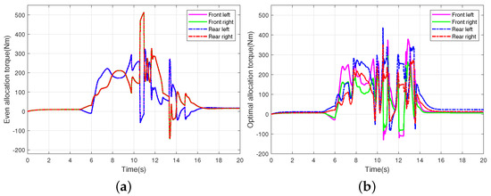 The lower torque distribution of the chassis control system was compared as shown in Figure 7, which shows that the torque distribution methods of the two methods are different. It is obvious that the maximum torque command of the even allocation algorithm is about 500 Nm, which is larger than the maximum torque of the optimized algorithm in this study. Since the difference between the left and right wheels is added in the average algorithm, it is not applicable to the requirement of energy saving.