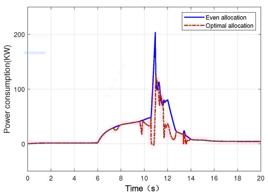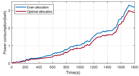 As can be seen in Figure 8, the optimal allocation method is significantly less power-consuming compared to the average allocation. The total energy consumption of the two methods will continue to accumulate over time, which has great advantages for extending the range of electric vehicles.