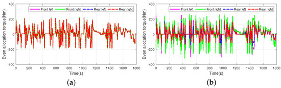 Torque distributions of the even allocation and optimal allocation in WLTC condition. (a) Torque distribution with even allocation in WLTC condition. (b) Torque distribution with optimal allocation in WLTC condition.