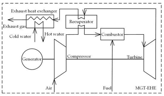 Rocha et al. [3] conducted full load and part load performance tests on the triplet power generation pilot plant based on a micro-turbine, and the experimental results showed that the power generation efficiency of the triplet power generation system with natural gas as fuel was 22.6%, and the energy utilization coefficient of the system reached 56.3%. Rosato et al. [4] evaluated the dynamic performance of the natural gas micro turbine co-generation system, and the results showed that, compared with a traditional system consisting of a natural gas boiler (which produces heat) and a central State grid (which produces electricity), the micro gas turbine co-generation system had a 13.4% reduction in primary energy consumption and an 18.9% reduction in CO2 equivalent emissions. Co-generation systems have a cost advantage of up to 20.9% over conventional systems in terms of gas consumption. Pehnt [5] evaluated the impact of micro co-generation distributed energy systems on the environment. The results showed that the micro gas turbine co-generation system had an advantage over the gas-fired power plants in terms of greenhouse gas emissions.