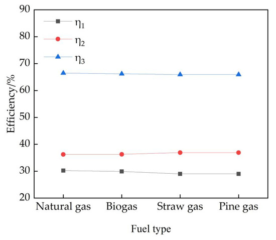 It can be seen from Figure 5 that when different kinds of fuel are used, the efficiency (η1) of the gas turbine in the recuperative cycle system increases with the increase in the load. The power generation efficiency (η1) of the natural gas system expands from 18.03% to 30.24%, and those of the biomass gas system changes from 17.83%, 17.30%, and 17.30% to 29.90%, 29.01%, and 29.01%, respectively.