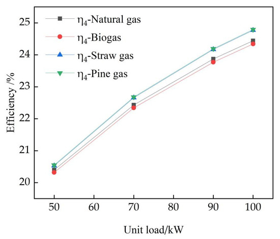 With the load increasing from 50 kW to 100 kW, the combined cycle electric efficiency (η4) of natural gas system expands from 20.40% to 24.44%, and the combined cycle electric efficiency (η4) of biomass gas systems expands from 20.32%, 20.53%, and 20.55% to 24.34%, 24.77%, and 24.79%, respectively.