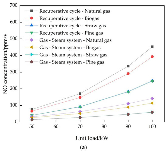 Figure 7a is the NO emissions chart of the gas turbine system under partial load operation. It can be seen that, in both systems, the increase in load leads to the gradual rise in combustor outlet temperature, which results in the increase of NO emissions. In the recuperative cycle system, the combustor outlet temperature for the natural gas case is the highest, and its NO emission is the largest, while the combustion chamber outlet temperature of the pine gas system is the lowest, and NO emission is the smallest.