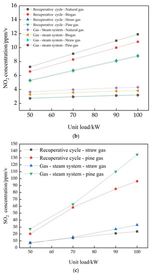 It can be seen from Figure 7c that the SO2 emission of pine gas is much higher than that of straw gas, because the sulfur content of the pine gas is greater than that of straw gas. With the increase in load, the increase in fuel flow and combustor temperature leads to increasing SO2 emissions.