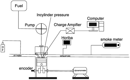 The basis of the test setup was a YANMAR L100V four-stroke, one-cylinder diesel engine, as shown in Figure 1. The engine specifications are presented in Table 2. In the hydrogen enhancement part, the injection volume of H2 at 1000 ppm was installed on the air intake manifold, whereas the injection timing adjustments were advanced at −16.5CA°BTDC regarding the mechanical fuel injection pump [30]. The purity of the hydrogen (99.98% vol.) was controlled with a mass flow controller to estimate the volumetric H2 required with theoretical calculations according to the test. The H2 concentrations were constantly monitored by continuous sampling with gas chromatography.