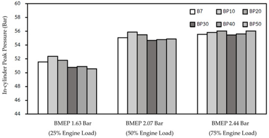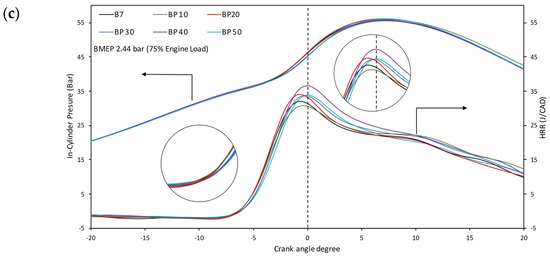 The variations in the in-cylinder pressure and heat release rate (HRR) for blended PPO operation at 25%, 50%, and 75% of the maximum load were 1.63 bar, 2.07 bar, and 2.44 bar IMEP, respectively, with a fixed engine speed (1500 rpm) compared with diesel fuel, as shown in Figure 2. The peak pressure and the HRR of the engine for the blended fuel performed reasonably with B7 due to the comparative cetane index in the diesel fuel range. However, as the cetane index indicates the ability to auto-ignite rapidly when fuel was injected into the engine with compressed and heated air, the results show that the effect of the blended PPO was a slightly longer ignition delay with higher-percentage pyrolysis oil blends [33,34]. Furthermore, the higher HRR values were found due to the fuel accumulation during the long ignition delay [22]. The ring structures of fuels with high aromatic components such as PPO cause them to typically have a higher adiabatic flame temperature [18], and the high adiabatic flame temperature effects the higher heat release rate [31]. Therefore, it can be seen in Figure 2 that the lower blends (BP10 and BP20) offered higher HRR values than B7 at similar ignition times with low and medium engine loads as the effect of the high aromatic component in PPO. However, the factor of the cetane index number overcame the flame temperature effects, as the higher amount of fuel injection in the high engine load reflected the decreases in the HRR values in BP10 and BP20, while BP40 and BP50 had the longest ignition delays with higher HRR values. These findings conformed to the in-cylinder peak pressure, which is shown in Figure 3. As the peak pressure depends on the combustion rate in the initial stages, it certainly showed that the blended PPO had a similar latent heat of evaporation compared to B7. The high oxygen content in PPO leads to a higher thermal efficiency than for B7, which causes the engine’s combustion process improvement [35].