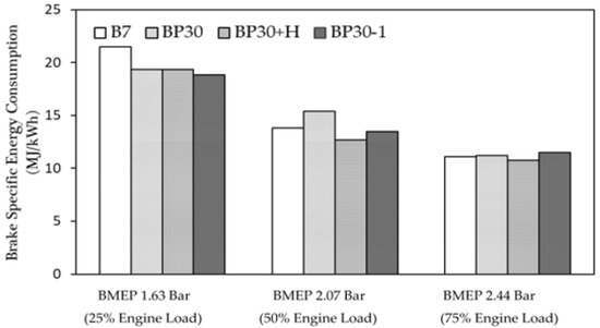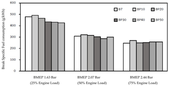 The brake specific fuel consumption (BSFC) of the different blends against the engine load is shown in Figure 4. It reveals that standard B7 fuel had the BSFC values of 478.34 g/kWh, 307.8 g/kWh, and 246.57 g/kWh at 25%, 50%, and 75% of the maximum load, respectively, which were higher than high blended PPOs (BP30, BP40, and BP50) in the 25% and 50% engine-load conditions. However, the opposite trend was seen for the BSFC for the high engine-load condition, as pyrolysis oil had a lower calorific value than B7 [25]. The BSFC tended to increase by 8%, 1.2%, 2%, 4.2%, and 4%, respectively, for the ratios of BP10, BP20, BP30, BP40, and BP50 with high engine load, as the lower viscosity of the blended fuel led to smaller fuel droplets being injected, less fuel penetration, inappropriate fuel–air mixing, and decreased combustion efficiency [36]. Moreover, the engine needed to maintain stable operating conditions, and the fuel injection rate was higher according to the amount of pyrolysis oil that was mixed. As the BSFC was the parameter to assess the fuel economy of the engine, increased proportionally blended PPO caused a lower calorific value. Therefore, more fuel was required to compensate for the lower calorific value of the blended fuel. However, compared to the price of fossil fuel and the sustainable advantage of the PPO, medium blend (BP30) is an interesting option due to the engine performance.