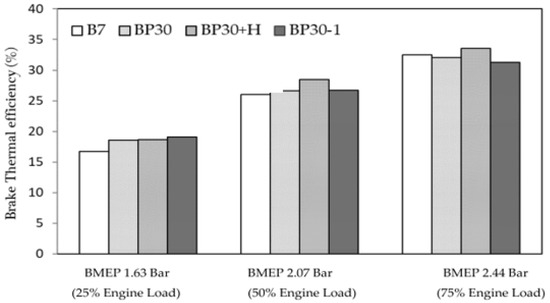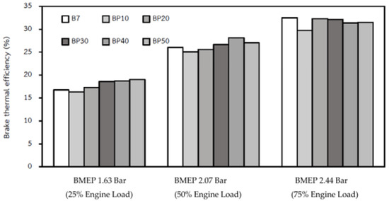 As the thermal efficiency is the ability of a fuel to be converted into mechanical output, the thermal efficiencies of the engine with blended fuel tended to increase with increases in the blended fuel ratio compared to B7, as presented in Figure 5. Considering the thermal efficiency of the engine’s 25% and 50% of maximum working loads, the high blended fuels (BP30, BP40, and BP50) resulted in higher thermal efficiency. Since the oxygen content in pyrolysis oil is higher than that of diesel fuel, it promotes better combustion, and the low viscosity of the pyrolysis oil makes the injection more diffuse, as occurred in low-density and low-viscosity blend fuels [37]. However, the opposite trend is seen for the magnitude with a high engine load. The thermal efficiency ratio of pyrolysis oil tends to be lower compared to diesel. The reason behind this phenomenon is that low viscosity causes better atomization and faster fuel vaporization, which results in an early ignition under a high engine load [38].