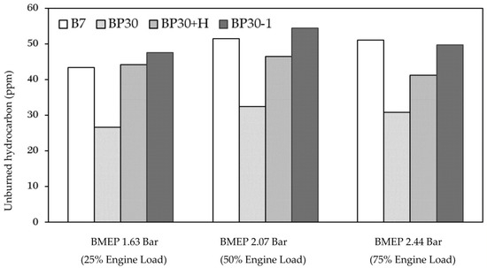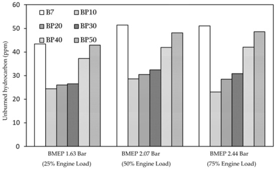 Since unburned hydrocarbon emissions are caused by the incomplete combustion of a fuel–air mixture, the high oxygen content in the PPO improves the combustion process, thereby reducing the number of unburned hydrocarbons left over from the combustion process, as presented in Figure 6 [39]. The unburned hydrocarbon emissions from all the blended PPO fuels were lower than for B7. However, the amount of the unburned hydrocarbon increased proportionally with the blend ratio due to the higher effects of the cetane index number and the longer ignition delay. This proved that the characterization of the oxygen content and the low viscosity of the PPO enhanced the combustion process [21].