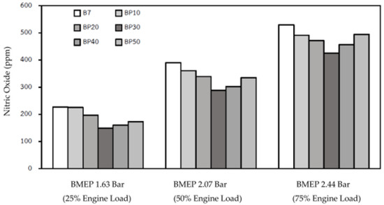 The effect of the blended fuel enhancement on NO compared with B7 is presented in Figure 15. The temperature in the cylinder, oxygen content, and residence time for the reactions all contributed significantly to NOx generation. Therefore, the higher the temperature in the combustion chamber was attributed to the growth of NO [35,38,44]. These results suggest that the amount of NO was rising according to engine load, as the high temperature induced the breakdown of nitrogen and oxygen into nitric oxide. Due to the relatively high vaporization capability of the low viscosity in BP30, BP30+H, and BP30-1, all of them achieved lower NO emissions than B7. The NO emissions for BP30 offered the lowest emission as high heat evaporation in the premix process [25]. Though the amount of nitric oxide increased with the presence of hydrogen gas in the combustion chamber in BP30+H, causing the combustion chamber temperature to rise as a consequence of the properties of hydrogen gas, it was still lower than for B7.