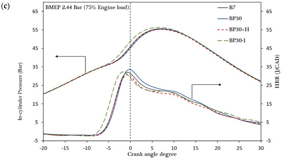 In-cylinder pressure profile and heat release rate in the combustion process with (a) a BMEP of 1.63 bar (25% engine load); (b) a BMEP of 2.07 bar (50% engine load); and (c) a BMEP of 2.44 bar (75% engine load).