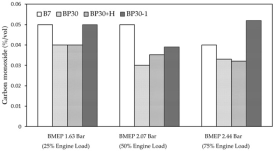 The effect of blended fuel enhancement compared with the B7 on CO is shown in Figure 14. In general, inefficient combustion processes with insufficient air–fuel mixing and CO that was unable to oxidize into CO2 were the main causes of HC and CO emissions [43]. Overall, the BP30 and BP30+H reflected lower CO emissions, as the high O2 content expanded the thermal efficiency for all engine loads. Moreover, researching the O2 in the exhaust gas showed that the level of access to oxygen in BP30 was the highest, while the BP+H emitted less than B7, as the intake air reduced the hydrogen input. However, the advanced injection timing caused higher CO emissions for all loads, which was related to the extended combustion duration and the elevated HC emissions due to the premix combustion leads absent of oxygen and the cold wall flame-quenching effect [43].