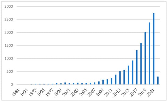The interest on renewable energy transition has increased over time, and this is reflected in the large number of papers on this field. Filtering from the Web of Science platform regarding the studies on this theme, we found 15,026 papers published from 1981 until the present day. As shown in Figure 1, the number of published papers in the area illustrates a hyperbolical progression; there is a jump in the number of publications after 2013. Thus, there is a growing interest in the field, the main interest being on renewable energy.