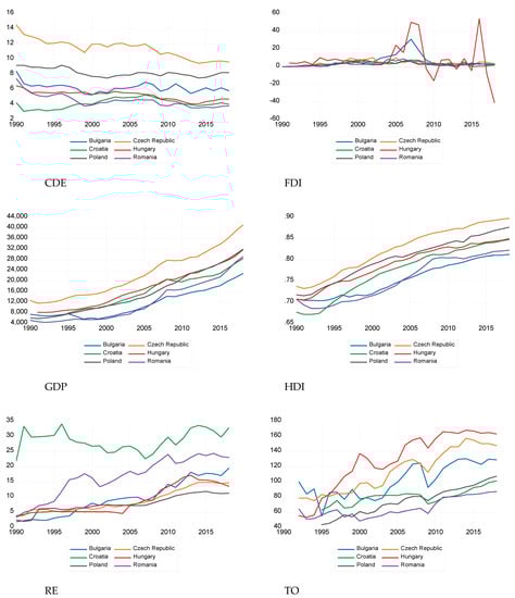 The variables reflecting renewable energy transition used annual data provided by the World Bank database over the time spanning from 1990 to 2018 (Table 1). The length of the period is dictated by the availability of data on energy consumption. Six countries are selected for the sample, representing the non-euro countries (Bulgaria, Czech Republic, Croatia, Hungary, Poland, and Romania). In order to draw an image of the status of renewable energy, most of the studies consider carbon dioxide emissions and renewable energy consumption as the core variables [91,92,93,94,95]. According to the extant literature, the economic development significantly influences the status of renewable energy. The level of economic development leading to renewable energy transition is usually reflected through investments [96,97,98], GDP [99,100,101,102], human development [103,104,105], and trade openness [106,107,108]. Therefore, the variables included in the analysis are carbon dioxide emission per capita (CDE), GDP/capita, renewable energy consumption as percentage of total energy consumption (RE), trade openness (TO), FDI, and human development index (HDI).