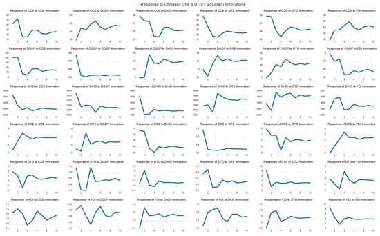 Using the impulse response function, the variables response to CDE is fluctuating. The reaction of each endogenous variable to the structural shocks occurring in the exogenous variables is shown in Figure 3 below.