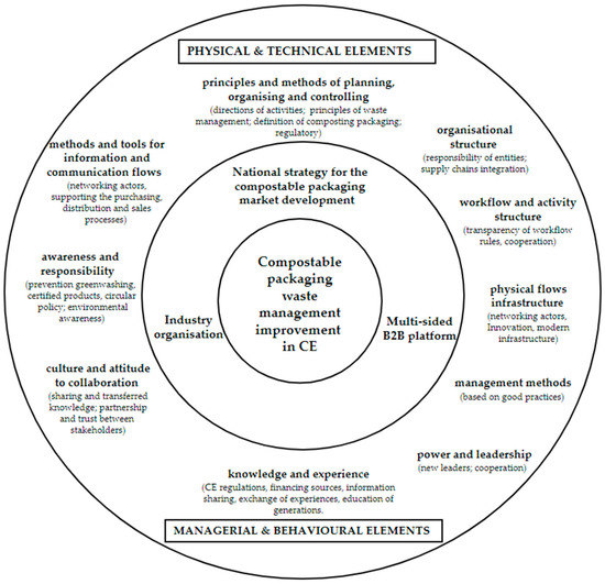 The group of physical and technical elements includes ‘hard factors’ and is related especially to principles, methods, structures, tools and infrastructure. Altogether, public administration’s failure to enforce the requirements for separate collection of waste from consumers, no quality control of bio-waste provided by consumers, inconsistent, changing, and inadequate and insufficient legal regulations for the market result in the need to implement principles and methods of planning, organising and controlling the packaging circular economy at strategic, and tactical and operational levels in the public and private spheres. Moreover, in the public sector, there is the potential to design the appropriate organisational structure between the EU, national, regional and local administrative entities. Such a structure can determine the appropriate levels of strategic document development and project implementation. Its application can be a remedy for long delays in the implementation of EU requirements and solutions in national legislation. Identification of the insufficient scope of joint work and cooperation between representatives of the public and private sectors proves the necessity to make efforts to share competences and tasks in a systemised workflow and activity structure between stakeholders. This component simultaneously addresses the need to enhance streams of uncontaminated bio-waste and extend catalogues categories of bio-waste, including compostable packaging. Depending on the type of processes, activities and its outputs, the workflow and activity structure is different, especially at the last stage of the compostable packaging lifecycle, namely at the bio-waste management phase. In the case of the composting process managed in composting plants on an industrial scale, compost as a product can be used in agriculture sectors. Another option is anaerobic digestion of bio-waste being a source of biogas that is considered as a renewable energy source used in various industrial sectors. Both types of outputs from compostable packaging waste management are desirable in the context of circularity and sustainability. Additionally, biogas is gaining more and more attention in energy transition. At the same time, it is desired to ensure methods and tools for information and communication flows in the system. This development may eliminate the lack of unambiguous markings on the packaging allowing for proper segregation after use, improving tools for communication between the private and public sectors, and eliminating misunderstanding between the legislator and private sector entities according to the needs of both parties. Finally, the development of physical flows infrastructure is critical. The need for higher interest and financial support for investments in the infrastructure is also postulated. Effective and successful exploitation of the above-mentioned physical and technical components requires synergy with managerial and behavioural elements called ‘soft factors’. Firstly, the recognition of high normative expectations towards producers of compostable packaging highlights the dominant role of regulations as a mechanism stimulating the activities of the market entities. There is a need to implement new management methods—not only reactive, but also proactive to market needs. Moreover, time pressure on internal stakeholders of bio-packaging supply chains to implement the emerging legislation, activities of lobbyists for the use of conventional packaging, as well as often conflicting objectives of the private and public sectors in the development of the compostable packaging market revealed the need to transform the power and leadership structure in the system. The following causes: low consumer awareness of separate bio-waste collection, the low level of consideration of compostable packaging circularity by local governments in investment priorities, insufficient public administration interest in bio-waste in the economic system, difficulties in creating appropriate legal provisions due to limited awareness of the implementation of the CE concept, determine the next required element of the system, which is awareness and responsibility of stakeholders. Furthermore, the lack of knowledge of composting plants regarding the properties of bio-packaging and the possibility of its composting, omitting expert comments from practitioners operating on the bio-packaging market in the legislative process, ambiguity of the terminological provisions of the law leading to misunderstanding of their content by bio-packaging producers, and staff shortages on the part of the legislator in the group of officials specialising in CE issues draw attention to the need to advance knowledge and experience in the field of compostable packaging. Culture and attitude to collaboration play an important role in their advancement. The importance of the last proposed component is raised by two causes, namely: undeveloped culture of cooperation between the administration and the private sector, and a lack of cooperation between the legislator and other stakeholders in the legislative process.