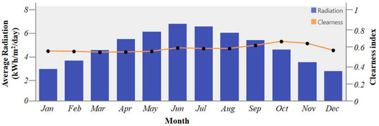 Turtuk is a high-altitude cold village in the rain shadows of the Himalayas with more than 300 days of sunshine and only 100 mm of precipitation annually [55]. The daily monthly average of radiation is 6–7 kWh/m2/day in summer and 3–4 kWh/m2/day, as presented graphically in Figure 2. Solar photovoltaic cells convert solar radiation into electrical power. The power produced by the PV array was computed through the specifications given by the manufacturer. The generic flat-plate PV was used to assess the proposed HPG system. The capital cost of solar panels was $470 per kW and O&M cost was $2.66 per year. The other technical specifications of this module are provided in Table 2. HOMER software has applied Equation (1) to calculate power output from the PV array [56]: