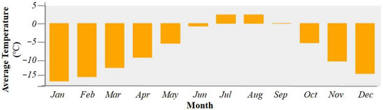 The energy received on earth from the sun is electromagnetic radiation. Solar irradiance is the power received from the sun per unit area. Thus, the amount of solar irradiance received at a particular region is the daily average of horizontal solar radiation globally, including the beam radiation received directly from the sun and the diffused radiation in the atmosphere. The estimation of annual electrical energy production from wind turbines is taken from the wind speed data of a particular region. Figure 2 shows the average solar global horizontal irradiation (GHI) and the clearness index of Turtuk village. GHI is the solar irradiance received on the horizontal surface of the earth. It is the summation of direct normal irradiance (DNI), diffuse horizontal irradiance, and ground-reflected radiation [49]. These data showed that the selected region experienced an average GHI of 4.89 kWh/m2/day. As shown in Figure 2, the maximum solar GHI was observed during June as 6.84 kWh/m2/day. The weather remained clear during this month. The selected region experienced an average clearness index of 0.586, as shown in Figure 2. Thus, the region had a good clearness index, and the PV array system received the optimum amount of sunlight to generate electricity. The monthly average temperature data are provided in Figure 3, with the annual average at −10 °C. The summer season in Turtuk village begins in June, with an average temperature of −1.2 °C. Wind energy also contributes to electricity production at night when there is no solar energy. At the time of this study, this village suffered from power outages and received power from the main grid for only 4 to 6 h. This region also experienced a wind speed of 7.26 m/s average, with maximum wind speed occurring in December, as shown in Figure 4.