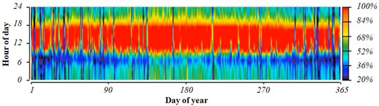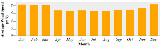 The considered location experienced an average wind speed of 7.26 m/s over the entire year. This became another renewable energy resource to generate electrical energy. The wind speed of a particular region is responsible for the amount of power produced by the wind turbine. HOMER calculates wind turbine output using the following three steps—(i) the wind speed is calculated at a particular hub height of wind turbine, (ii) the amount of power produced by a wind turbine at the wind speed, calculated in step (i), at standard air density, and (iii) finally, this output power value is attained for actual density of air. HOMER used Equation (3) to calculate output power from wind turbines [58].
