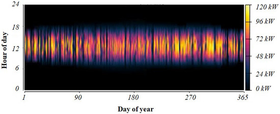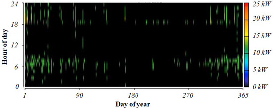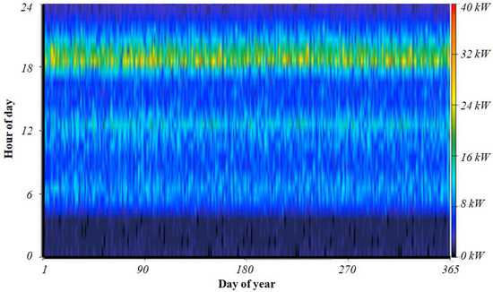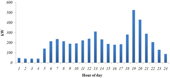 The simulation was done considering a project lifetime of 25 years in HOMER software. The results obtained from the simulation assisted in choosing an optimal configuration for the HPG system. A total of 133,156 solutions were simulated by HOMER software, out of which nine optimized configurations of HPG system were obtained for attaining the minimum cost of energy, as presented in Table 6. The HOMER software performed simulations for all combinations, using PV array system, wind turbine, DG, and BSS. The PV-Wind-BSS-DG configuration attained the minimum cost of energy, considered the optimal low-cost solution with respect to the other solutions. In this study, the load-following (LF) control strategy was also considered. In this strategy, the generator operates only enough to meet the demand of the primary load. The charging of battery is done when renewable sources of energy like solar panels and wind turbines operate. In the LF control strategy, the generator can still produce more electricity to sell to the grid, if it has economic benefits. In simulations performed by HOMER, the program considered a shortfall occurring between the required operating capacity and the actual amount of operating capacity the system can provide. This figure is represented as capacity shortage constraint [64]. The sensitivity analysis was also conducted. These comparisons helped to determine the economic viability of the project. The average daily residential load for the considered location was predicted to be approximately 200 kWh/day. The average load was 8.33 kW/day, and the peak load was 37.13 kW. The daily consumption pattern of the residential load is shown in Figure 5.