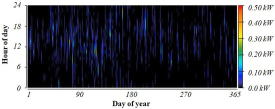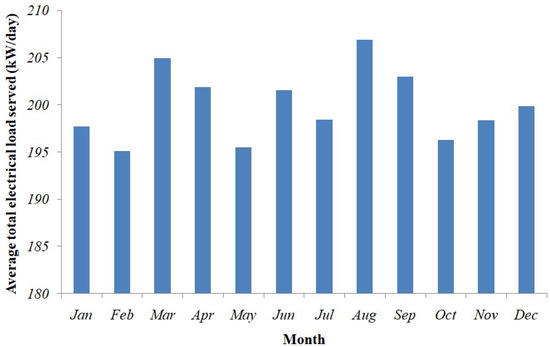 A comprehensive survey of the selected site was conducted to find the power consumption by load and estimate the load profile of a typical household. The village households consume power through five types of appliances. As shown in Table 1, the average load of compact fluorescent lamp (CFL) lighting per house was the highest among all the appliances in a given day. Radio consumed the lowest amount of electricity per day due to less usage. The total load of 300 households was taken as 199.5 kWh/day. The average consumption pattern for 24 h in a day of residential load is shown in Figure 5. It can be observed from Figure 5 that maximum electricity consumption occurred around the 19th hour of the day. The minimum consumption occurred between the first and fourth hour of the day. Likewise, the average monthly and yearly total electrical load served at the selected location is provided in Figure 6 and Figure 7, respectively. It was observed that the electricity consumption in March and August was highest compared to other months.