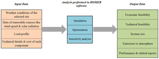 In this article, the chosen optimization tool for simulating hybrid power plants was the Hybrid Optimization of Multiple Energy Resources (HOMER) software. This software can simulate several available technologies with varying costs and variations in the availability of renewable energy sources. It includes optimization and sensitivity analysis algorithms to ease decision-making [53]. The software conducts several simulations to evaluate optimized solutions that can balance demand and supply of electricity. It provides the technical and economic perspective of different renewable energy sources by evaluating the loads served by the projected technology. Figure 8 shows the step-by-step chart of HOMER software. The algorithm used by HOMER software is provided as Figure A1 in Appendix A.