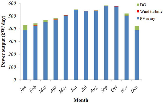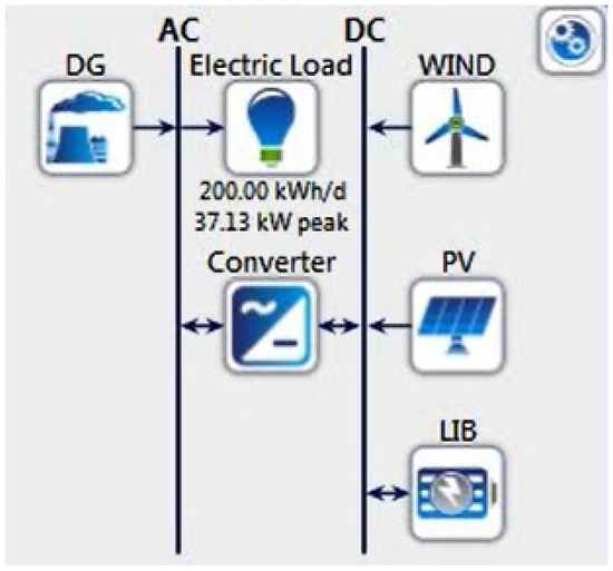 The components included in the HPG system included a solar photovoltaic (PV) array system, battery storage system (BSS), wind turbine, and DG. The PV array system, BSS, and wind turbine were connected to DC bus, while DG was connected to AC bus, as shown in Figure 9. The load connected to the HPG system required an AC power supply, while BSS required DC power to charge, so a converter was added to this hybrid system. The converter’s function was to optimize conversion from AC power to DC power and vice versa, depending on the direction of energy flow [54]. As power output from renewable resources depends on weather conditions, DG provided a necessary backup to the load in case of a shortfall from these resources. The proposed HPG system was expected to supply electricity to a residential community in Turtuk village, with an average and peak load of 200 kWh/day and 37.13 kW peak, respectively. These details and their related diagrams were acquired from HOMER software.