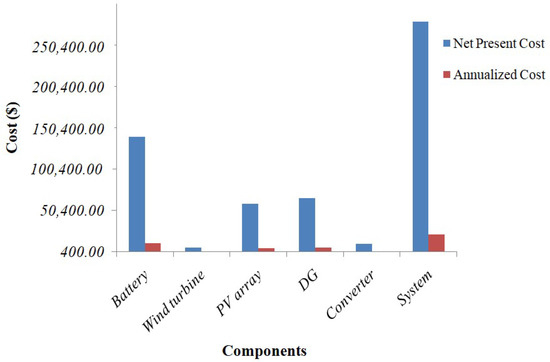 The proposed configuration for the HPG system consisted of PV (115 kW)/Wind (1 kW)/BSS (164 strings of 6 V each)/DG (50 kW). It had LCOE, NPC, and operating costs of $0.29 per kWh, $278,176, and $7542, respectively. The cost summary of the components for this configuration is indicated in Table 7. BSS made up 49.96% of the capital cost in this configuration, while the PV array system constituted 20.91%. The wind turbine comprised only 2.02% due to high capital and replacement cost. The DG made up 23.50% of the total cost, and the system converter was only 3.59% of the capital cost. The NPC and annualized cost of the above mentioned components are compared in Figure 13. NPC provide estimation of cash flow, showing the present value of installation and O&M over the lifetime of the component, while annualized cost differentiated the components as (1) low capital and high O&M and (2) high capital and low O&M costs. DG fell under the former category, while PV, wind turbine and BSS fell under the latter. In this layout of the HPG system, renewable energy sources constituted 22.94% of the total cost. In contrast, DG, BSS, and converter constituted 77.06% of the total cost.