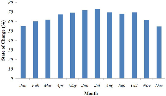 The excess energy generated from renewable energy sources can be stored in devices like batteries. Whenever power from the grid is not available, the load can be powered using this stored energy. Moreover, it is beneficial to increase the renewable penetration in the HPG system in order to permit turning off the DG during the daytime. Another benefit is that the BSS stores the excess power produced and prevent edit from going to waste. This ensures a consistent power supply in case of a shortfall from renewable energy sources. As BSS forms an essential component of the HPG system, monitoring the battery state-of-charge (SOC) becomes vital. It protects the battery from overcharge and improves its life. In other words, the SOC of a battery is defined as the ratio of its current capacity (Q(t)) to the nominal capacity (Qn) (refer Equation (5)) [59].