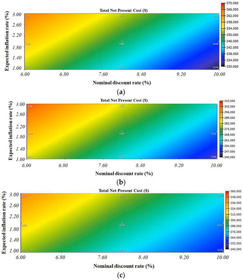 The salvage value is also an important economic parameter to assess the economic performance of a hybrid system. During NPC calculation, the remaining value of the components of the proposed HPG system, at the end of the project’s life span, called the salvage value, was also considered. HOMER made two assumptions during calculation of salvage value: first, that (a) components depreciate linearly, meaning that the salvage value of components was directly related to their remaining life spans, and (b) that salvage value depends on the cost of replacement. HOMER calculated salvage value using Equation (9) [59]. In the various cost calculations, HOMER applied an annual rate of interest because it presumed that all prices rose at the same rate.