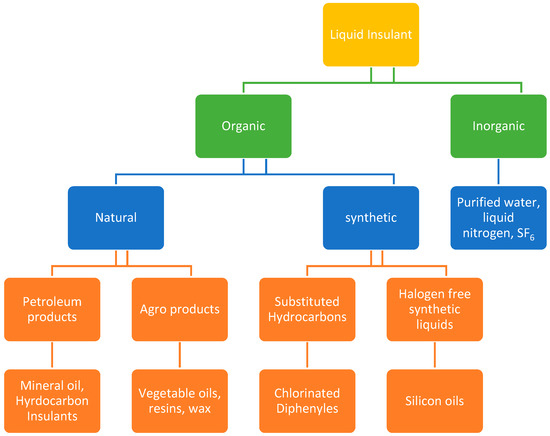 Figure 1 presents the flowchart for the classification of insulating liquids used for insulation and cooling purpose in high voltage equipment. Liquid insulants are broadly classified as organic and inorganic. Organic insulants are further classified into two types, natural and synthetic, that include petroleum-based products i.e., mineral insulating oil, vegetable oils, resins, wax, agro-products, etc. The synthetic insulants include synthetic hydrocarbons such as alcohols and hydrocarbons, and halogen-free synthetic liquids (silicon oils) that offer better insulation properties similar to mineral oils with better thermal stability and less flammability. Liquid nitrogen and SF6 are categorized as inorganic insulants that are used as electric insulating material in circuit breakers, cables, capacitors, and transformers.