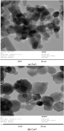 TEM images of (a) ZnO and (b) CuO nanoparticles.