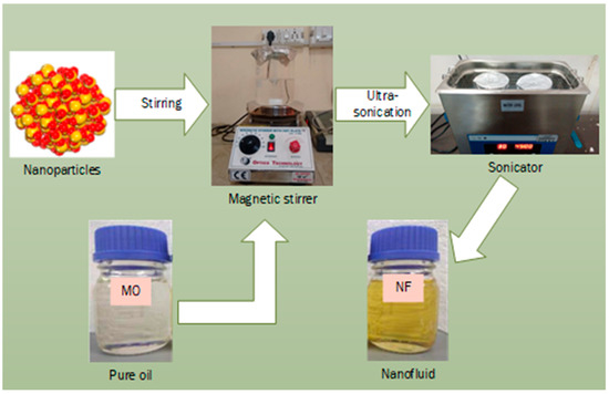 Two different types of nanoparticles, i.e., ZnO (conductive) and CuO (semi-conductive) are utilized to analyze their effect on pure SE fluid. Figure 2 shows the TEM images of ZnO and CuO nanoparticles. Six individual nanofluid samples were prepared by including ZnO and CuO nanomaterials, i.e., with three different concentrations of each nanoparticle, i.e., 0.01 wt%, 0.02 wt%, and 0.04 wt% in pure SE oil. The two steps method is used in the present work to prepare nanofluids as it is a commercial and widely accepted method [14,15]. The nanofluid preparation method involves various physical and thermal processes that consist of stirring and ultrasonication of prepared samples to homogeneously mix nanoparticles in the pure SE oil as shown in Figure 3. The time period of stirring for nanofluid samples is 25 min. Moreover, the time period for ultra-sonication of nanofluid samples is about one hour, and the operating temperature is 40 °C. The two above-mentioned processes make the sample ready for testing. The nanoparticles were carefully weighed using a Nano weight scale. The materials were procured from sigma Aldrich and were further reduced in size using a top-down nanotechnology technique. The sonication process produces high frequency waves (40 kHz), which homogeneously disperse nanoparticles in pure oil, and completes the nanofluid preparation process.