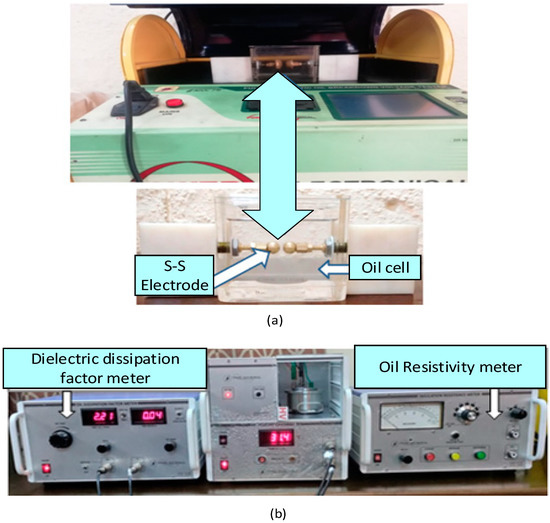 DC resistivity and dissipation factor of oils are determined using the PE-ORDF-2 model as shown in Figure 4. The equipment comprises a Dielectric dissipation factor and a DC resistivity meter. The AC bdv is measured by means of an oil breakdown tester, which is shown in Figure 4a. The heating chamber comprises of an oil cell that has a three-electrode system (high voltage electrode, low voltage electrode, and guard electrode). The nanofluid samples were heated at 23 °C, 40 °C, and 60 °C, respectively. The voltage level of 250 V is selected for measurement. A fully automatic oil breakdown tester is utilized to measure the AC breakdown voltage of the nanofluids. The sphere–sphere electrodes configuration is used with a separation of 2.5 mm between them. The repetitive breakdown measurement is performed on each prepared nanofluid sample. The time period between the two consecutive breakdown measurements is at least 2 min so that no gas bubbles exist between the electrodes before each breakdown measurement. The oil temperature is suitably changed within a heating chamber, as shown in Figure 4b.