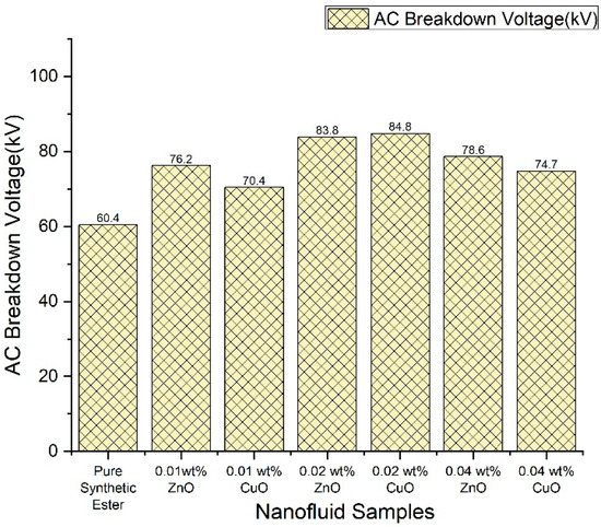Variation of AC breakdown voltage for changed concentrations of nanofluids.