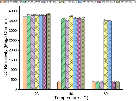 The addition of nanoparticles significantly increases DC resistivity [23], as can be seen from the graph of DC Resistivity with temperature in Figure 7. As given in Table 5 Up to 40 °C, the resistivity of pure synthetic esters rapidly decreases and remains constant after that point. This effect occurs because, as the temperature of the insulating liquid rises, the firmly bound electrons to the nuclei gather enough energy to be thrown out of their source atoms and become current carriers, lowering the liquid’s resistivity. However, for temperatures below 40 °C for both ZnO and CuO, the DC resistivity is greatly increased due to nanoparticles addition. The conclusion that the nanoparticles are capturing the free electrons and inhibiting streamer development, reducing conductivity and improving resistivity, is therefore clear from the results. The reason for improved resistivity of nanofluids can be attributed to the electron scavenging by the nanoparticles, since the nanoparticles are rapidly polarized due the applied electric field and attach themselves with the negatively charged carriers and reduce the flow of electrons in the oil. As a result, this reduces the conductivity, and hence the resistivity of oil is improved. For temperatures beyond 40 °C, the results shown by 0.03 wt% concentration ZnO NF is superior to 0.01 wt% and 0.02 wt% concentrations as opposed to 0.01 wt% concentration for CuO nanofluids. Thus, CuO nanofluid is less stable at higher concentrations of nanoparticles and at higher temperatures as the resistivity drops due to various factors such as heat dissipation, impurities, undesired moisture content or solid particles in the oil and aggregation, etc., whereas for ZnO nanofluids, the concentration below 0.04 wt% does not yield a sufficient number of nanoparticles, and the rate of generation of free electrons exceeds the rate of electrons getting trapped by the nanoparticles resulting in a decrease of resistivity.