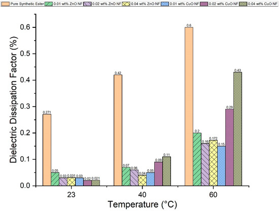 Nanofluids’ dielectric dissipation factor rises as the temperature rises. This is owing to the oil’s degradation, and the nanomaterial’s susceptibility to oxidation at high temperatures because of its low density, which introduces an effect of aging and ultimately leads to failure of insulation.