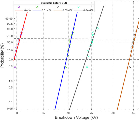 - The statistical technique applied gives enhanced breakdown voltage uniformly for synthetic esters due to ZnO and CuO nanoparticles at all probabilities, specifically more pronounced at lower concentrations and higher probability.