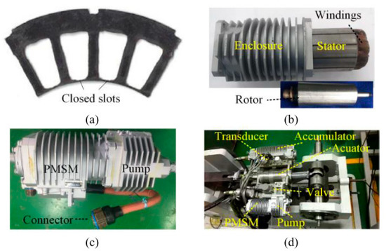 Photographs of the stator sheet, machine composition, machine and pump, and the EHA. (a) Stator sheet in PMSM. (b) Enclosure, windings, rotor and stator in PMSM component parts. (c) Energy supply system consisting of PMSM and axial piston pump. (d) EHA. Reprinted with permission from Ref. [23]. 2021, IEEE.